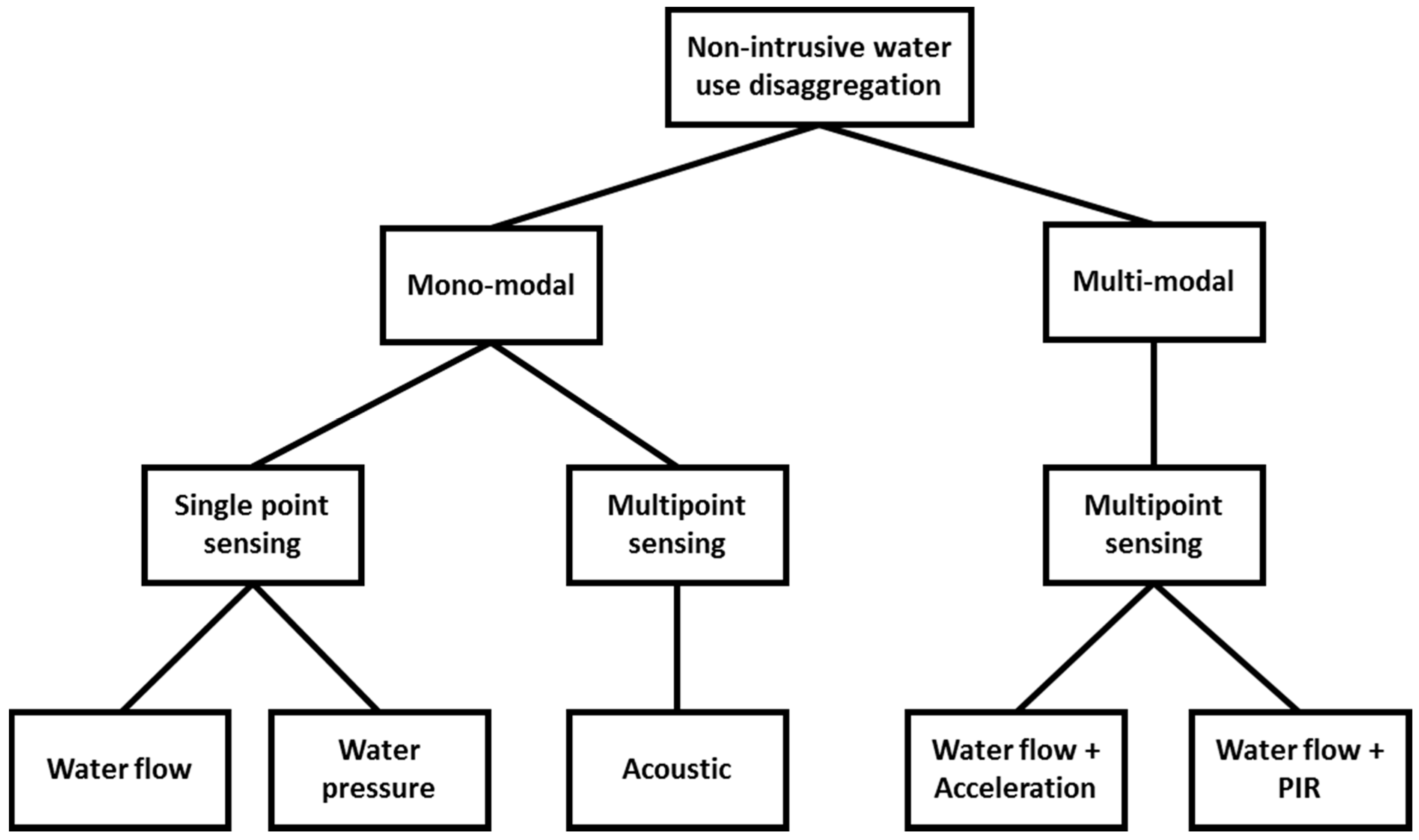 While single-point sensing solutions are typically based on a single modality, multi-point approaches can utilise one or more different sensing modalities. Approaches that utilise a single sensing modality are referred to as mono-modal sensing approaches, while approaches that utilise multiple sensing modalities for water use disaggregation are referred to as multi-modal.