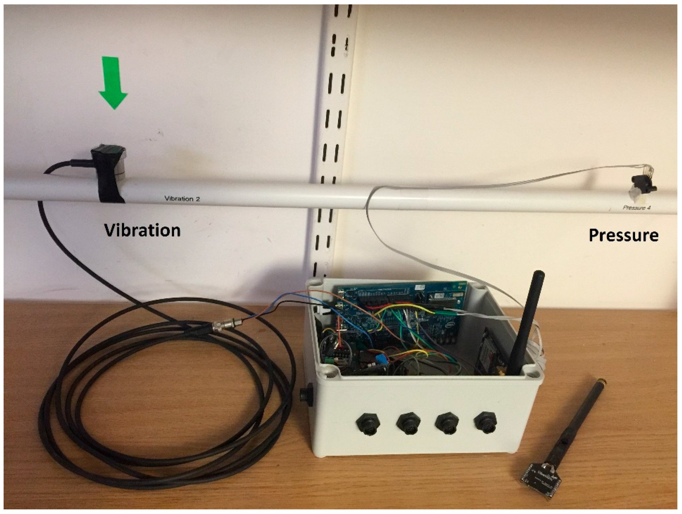 Multi-modal methods exploit multiple sensing modalities in order to perform water usage disaggregation. They are able to exploit a richer set of features derived from independent sensing streams to perform classification of water end usage events. Figure 4 shows a lab setting with multiple sensors (pressure and vibration) deployed on a pipe and wired to a gateway.