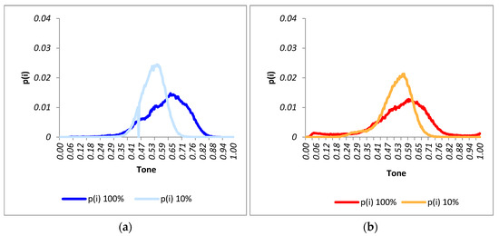 To conduct a more thorough analysis of the results, the obtained data matrices were represented using histograms. In these histograms, the X-axis represented the normalized grayscale tone ranging from 0 to 1, i, and the Y-axis showed its probability of occurrence, p(i), according to the expression derived from [6]: