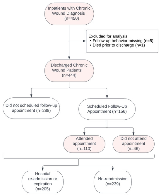 Introduction: Chronic wounds affect approximately six million people in the United States. Despite established multidisciplinary wound care protocols, patient adherence to follow-up care remains suboptimal. We aimed to understand the impact of social drivers of health on patient decision-making for improving wound care follow-up adherence. Methods: We conducted a retrospective review of all hospitalized patients who consulted in-house wound care staff at a tertiary care center between August 2017 and June 2020, regardless of primary admission diagnosis. Referred patients received standardized care from a multidisciplinary team at an outpatient wound care facility. Primary endpoints were pre-discharge scheduling and follow-up rates. Follow-up efficacy was assessed through 90-day hospital readmission rates. Results: Of 444 patients, 205 (46.2%) were readmitted or expired within 90 days. Adjusted analysis identified lack of follow-up care reception as an independent predictor of hospital readmission (hazard ratio 2.39; 95% CI, 1.45–3.89; p < 0.001). Among 156 (35.1%) patients who scheduled follow-up, 110 (70.5%) adhered to their appointment. Patients not scheduling follow-up were older (median age 79 vs. 70 years, p < 0.001), longer hospital stays (median 9 vs. 6 days, p < 0.0001), and more frequently discharged to skilled nursing facilities (47.6% vs. 26.3%, p < 0.0001). Among scheduled patients, skilled nursing home residents demonstrated lower follow-up adherence (OR 0.3; 95% CI, 0.14–0.65; p < 0.01). Conclusions: Pre-hospital discharge communication for scheduling follow ups serves as a critical intervention point in patient decision-making for wound follow-up. Considering the limitations of a retrospective single-center study, we find that pre-discharge education about follow-up scheduling for high-risk groups, including patients ≥ 80 years and skilled nursing facility residents, may improve follow-up adherence and reduce readmissions.