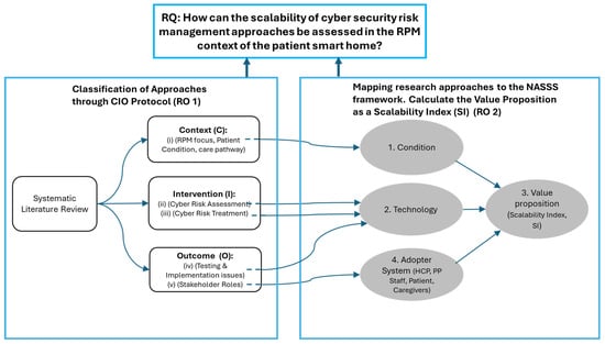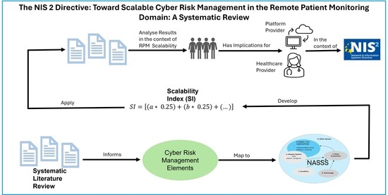 Healthcare 5.0 and the Internet of Medical Things (IoMT) is emerging as a scalable model for the delivery of customised healthcare and chronic disease management, through Remote Patient Monitoring (RPM) in patient smart home environments. Large-scale RPM initiatives are being rolled out by healthcare providers (HCPs); however, the constrained nature of IoMT devices and proximity to poorly administered smart home technologies create a cyber risk for highly personalised patient data. The recent Network and Information Systems (NIS 2) directive requires HCPs to improve their cyber risk management approaches, mandating heavy penalties for non-compliance. Current research into cyber risk management in smart home-based RPM does not address scalability. This research examines scalability through the lens of the Non-adoption, Abandonment, Scale-up, Spread and Sustainability (NASSS) framework and develops a novel Scalability Index (SI), informed by a PRISMA guided systematic literature review. Our search strategy identified 57 studies across major databases including ACM, IEEE, MDPI, Elsevier, and Springer, authored between January 2016 and March 2025 (final search 21 March 2025), which focussed on cyber security risk management in the RPM context. Studies focussing solely on healthcare institutional settings were excluded. To mitigate bias, a sample of the papers (30/57) were assessed by two other raters; the resulting Cohen’s Kappa inter-rater agreement statistic (0.8) indicating strong agreement on study selection. The results, presented in graphical and tabular format, provide evidence that most cyber risk approaches do not consider scalability from the HCP perspective. Applying the SI to the 57 studies in our review resulted in a low to medium scalability potential of most cyber risk management proposals, indicating that they would not support the requirements of NIS 2 in the RPM context. A limitation of our work is that it was not tested in a live large-scale setting. However, future research could validate the proposed SI, providing guidance for researchers and practitioners in enhancing cyber risk management of large-scale RPM initiatives.
