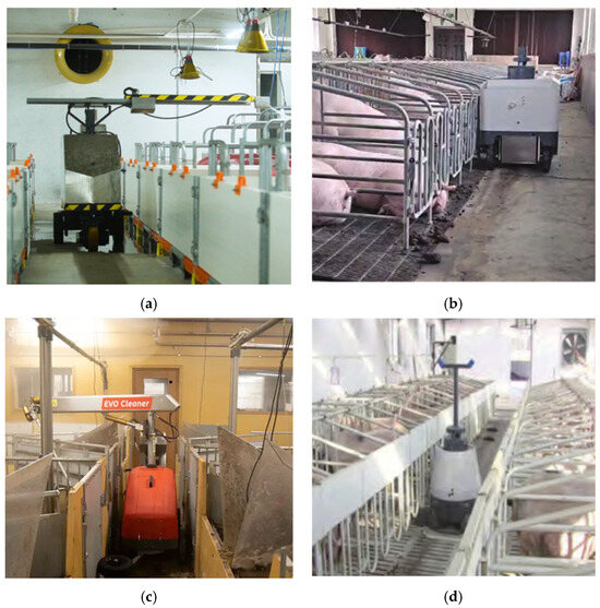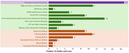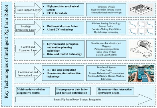 With the rapid development of artificial intelligence (AI), the Internet of Things (IoT), and robotics technology, the intelligent transformation of pig farms has become an inevitable trend in the livestock industry. In today’s large-scale pig farms, the traditional breeding methods are undergoing significant transformation due to the application of intelligent robotics technology. The robotic system is capable of performing autonomous inspection, precise feeding and environmental cleaning, which can effectively alleviate labor shortages on farms. It also shows great advantages in strengthening biosecurity, optimizing management processes and ensuring animal welfare. This paper systematically constructs the key technical framework of pig farm robots, including the basic support layer, the perception and execution layer, the intelligent processing layer, and the integrated application layer. On this basis, further analysis is conducted on the current application of robots in intelligent pig farms, covering the functional characteristics and technical implementations of inspection robots, cleaning robots, and feeding robots.