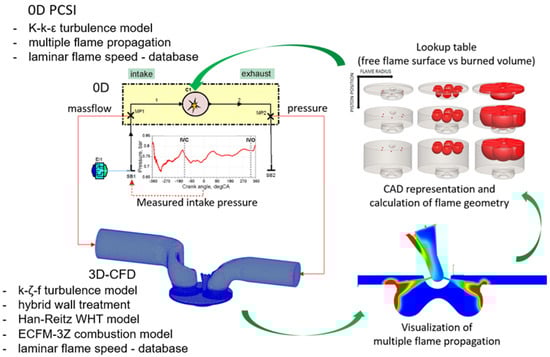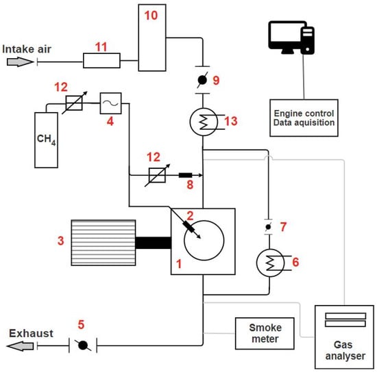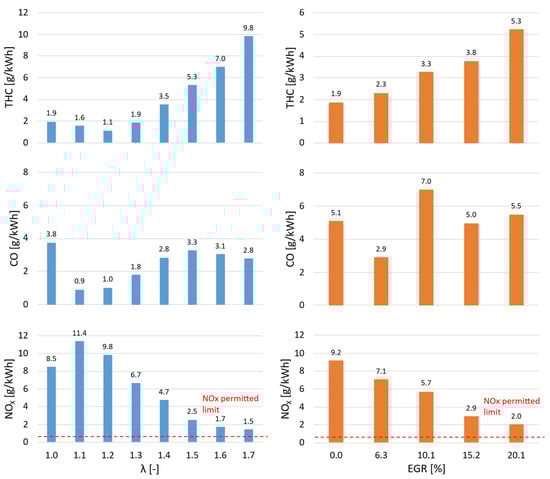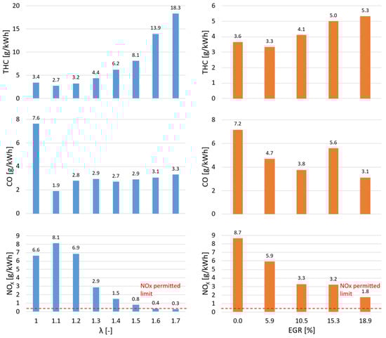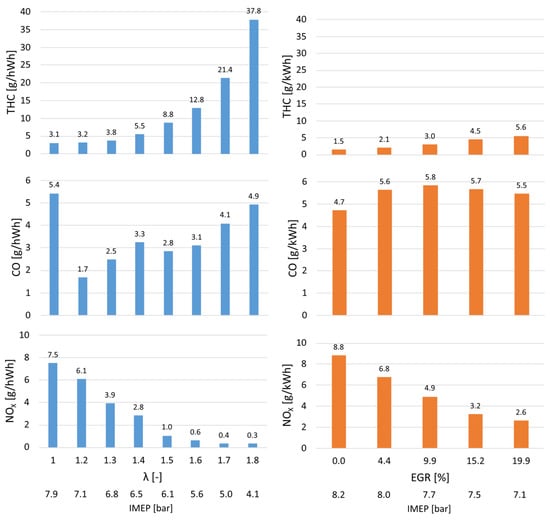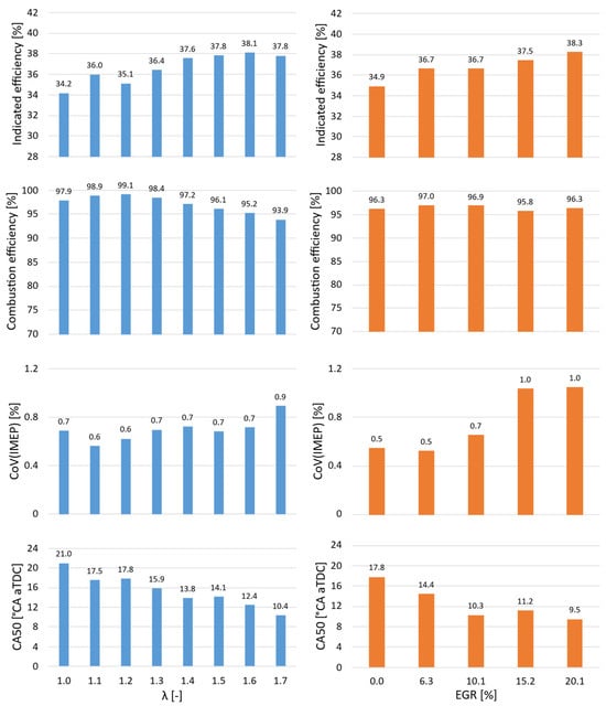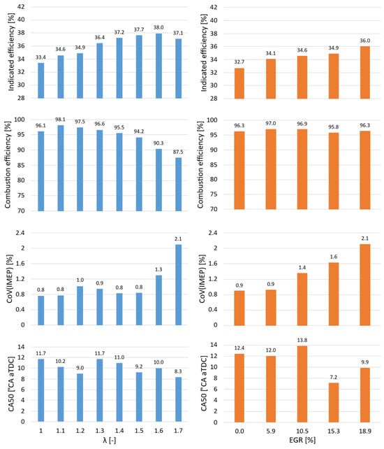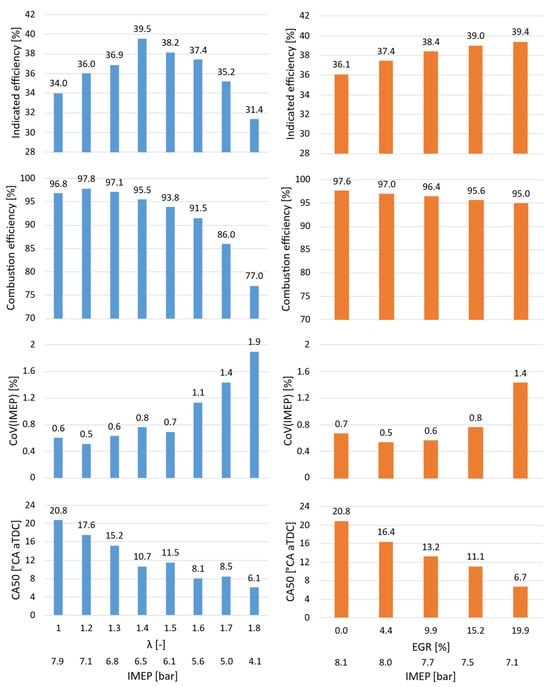 Improving the efficiency of spark-ignited (SI) engines while simultaneously reducing emissions remains a critical challenge in meeting global energy demands and increasingly stringent environmental regulations. Lean burn combustion is a proven strategy for increasing efficiency in SI engines. However, the air dilution level is limited by the mixture’s ignition ability and poor combustion efficiency and stability. A promising method to extend the dilution limit and ensure stable combustion is the implementation of an active pre-chamber combustion system. The pre-chamber spark-ignited (PCSI) engine facilitates stable and rapid combustion of very lean mixtures in the main chamber by utilizing high ignition energy from multiple flame jets penetrating from the pre-chamber (PC) to the main chamber (MC). Together with the increase in efficiency by dilution of the mixture, nitrogen oxide (NOX) emissions are lowered. However, at peak efficiencies, the NOX emissions are still too high and require aftertreatment. The use of exhaust gas recirculation (EGR) as a dilutant might enable simple aftertreatment by using a three-way catalyst. This study experimentally investigates the use of EGR as a dilution method in a PCSI engine fueled by methane and analyzes the benefits and drawbacks compared to the use of air as a dilution method. The experimental results are categorized into three sets: measurements at wide open throttle (WOT) conditions, at a constant engine load of indicated mean effective pressure (IMEP) of 5 bar, and at IMEP = 7 bar, all at a fixed engine speed of 1600 rpm. The experimental results were further enhanced with numerical 1D/0D simulations to obtain parameters such as the residual combustion products and excess air ratio in the pre-chamber, which could not be directly measured during the experimental testing. The findings indicate that air dilution achieves higher indicated efficiency than EGR, at all operating conditions. However, EGR shows an increasing trend in indicated efficiency with the increase in EGR rates but is limited due to misfires. In both dilution approaches, at peak efficiencies, aftertreatment is required for exhaust gases because they are above the legal limit, but a significant decrease in NOX emissions can be observed.
