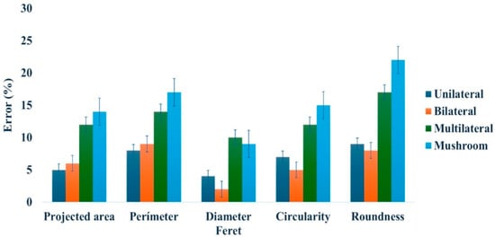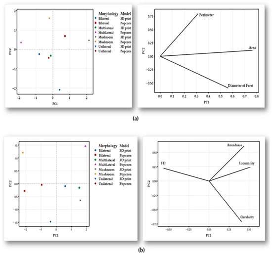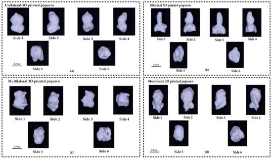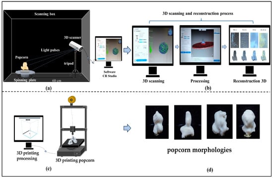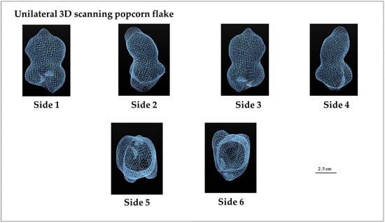 Popcorn maize (Zea mays everta) exhibits complex morphologies that challenge structural analysis. This study assessed the fidelity of the three-dimensional (3D) reconstruction and printing of four popcorn morphologies, unilateral, bilateral, multilateral, and mushroom, by integrating structured-light 3D scanning and (DIA), which can support the construction of food replicas. Morphometric parameters (projected area, perimeter, Feret diameter, circularity, and roundness) and fractal descriptors (fractal dimension, lacunarity, and entropy) were quantified as the relative ratios of printed/real parameters (P/R) to compare real flakes with their 3D-printed counterparts. Results revealed the lowest mean errors for Feret diameter (6%) and projected area (10%), while deviations in circularity and roundness were more pronounced in mushroom flakes. With respect to the actual mean values of the morphological parameters, real flakes showed slightly larger perimeter values (86 mm for real and 82 mm for printed objects) and a higher fractal dimension (1.36 for real and 1.33 for printed), indicating greater texture irregularity, whereas the projected area remained highly comparable (225 mm2 in real/229 mm2 in printed). These parameters reinforced that the overall morphological fidelity remained high (P/R = 0.9–1.0), despite localized deviations in circularity and fractal descriptors. Less complex morphologies (unilateral and bilateral) demonstrated higher structural fidelity (P/R = 0.95), whereas multilateral and mushroom types showed greater variability due to surface irregularity. Fractal dimension and lacunarity effectively described textural complexity, highlighting the role of flake geometry and moisture in determining expansion patterns and printing accuracy. Principal Component Analysis confirmed that circularity and fractal indicators are critical descriptors for distinguishing morphological fidelity. Overall, the findings demonstrated that 3D scanning and printing provided reliable physical replicas of irregular food structures as popcorn flakes supporting their application in food engineering.