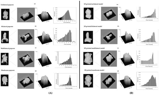 Popcorn maize (Zea mays everta) exhibits complex morphologies that challenge structural analysis. This study assessed the fidelity of the three-dimensional (3D) reconstruction and printing of four popcorn morphologies, unilateral, bilateral, multilateral, and mushroom, by integrating structured-light 3D scanning and (DIA), which can