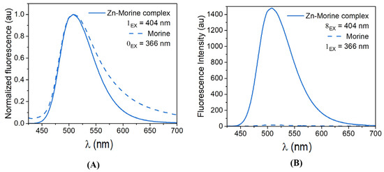 Flavonoids, natural organic compounds from the polyphenolic group with broad bioactive and pharmaceutical properties, are strong ligands for many metal ions. This work describes the formation of the complex between Zn(II) and morin. The synthesized compound is characterized using three analytical techniques, i.e., 1H NMR, IR, and thermal gravimetric analysis. Importantly, the complex was successfully obtained in the form of a solid, which enables its further physicochemical and structural characterization. Physicochemical characterization of the Morin-Zn complex was performed by steady-state and time-resolved spectroscopy. The absorption spectrum of the complex contains two main bands at ca. 407–415 nm and ca. 265 nm, and the complex emits yellow-green light with higher intensity than the free ligand. In the next step, morin and zinc complex were dispersed in a PMMA (poly (methyl methacrylate)) polymer matrix, and respective thin layers were produced. The studied thin films were deposited on silicon substrates by using the spin-coating method and characterized by X-ray photoelectron spectroscopy (XPS), Atomic Force Microscopy (AFM), Spectroscopic Ellipsometry (SE), UV-VIS spectroscopy, and photoluminescence (PL). The absorption of thin layers showed, similarly to solutions, the presence of two transitions: π→π* and n→π*, and a bathochromic shift for the morin-zinc complex compared to morin. The photoluminescence of the complex thin film showed two bands, the first in the range of 380–440 nm corresponding to PMMA, and the second with a maximum at 490 nm, derived from the synthesized compound.