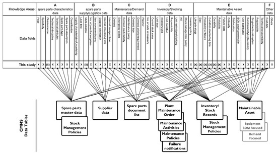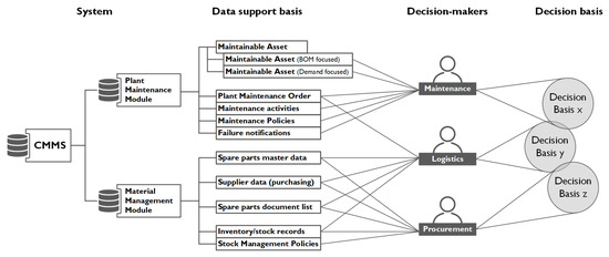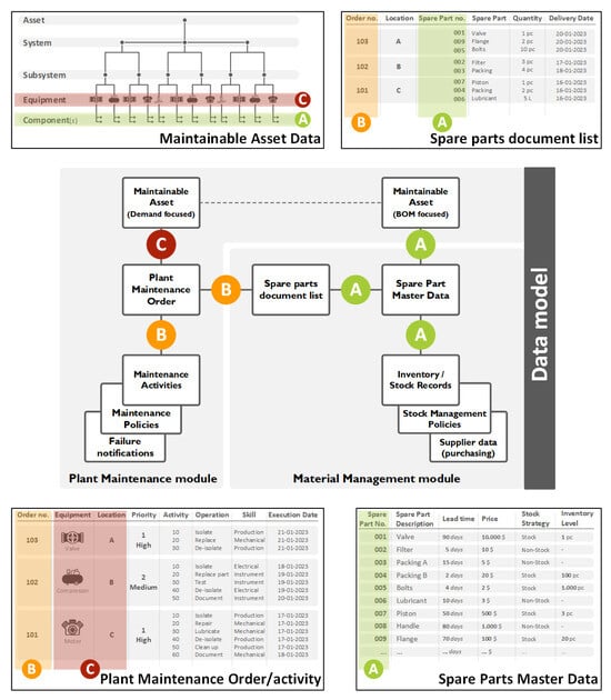 Effective spare parts management (SPM) is imperative for equipment-intensive organizations to reduce equipment downtime through maintenance. Despite the extensive availability of data-driven SPM methodologies, decision-makers are challenged and tend to rely on tacit knowledge and simple approaches due to extensive data-gathering requirements and fragmented information across multiple organizational IT systems and departmental knowledge silos. A review of 60 academic SPM contributions demonstrated that data remains siloed and that research is limited in integrating data across SPM-relevant knowledge areas. This study proposes an empirical SPM data model to address this gap by consolidating and linking spare parts with maintenance, logistics, inventory, and equipment data, thus forming a coherent database across the identified SPM knowledge areas to bridge data silos and reduce data-gathering requirements. A case study assesses the effects of model implementation for decision-making on 10,843 spare parts and shows that model implementation led to a 15.1% stock value reduction, a 76–91% full-time equivalent resource improvement, a 4–5% decision quality improvement, and an enhancement of decision-maker engagement. The data model reduces data-gathering efforts, enhances data accessibility, and improves decision quality and consistency.