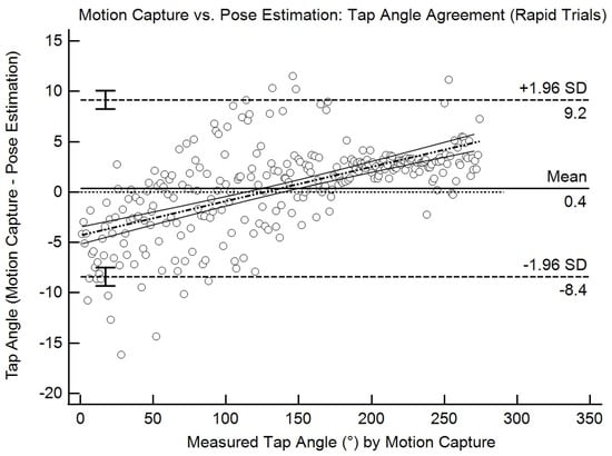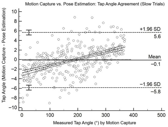 Accurate and accessible motor function quantification is important for monitoring the movement disorders’ progression. Manual muscle testing models and wearable sensors can be costly or reduce degrees of freedom. Artificial intelligence, especially human pose estimation (PE), offers promising alternatives. This work aims to compare the accuracy of a 2D PE tool for the Finger Tapping Test (FTT) with a 3D infrared motion capture system (MoCap). PE tracked three anatomical landmarks (wrist, thumb, index finger), while reflective markers were placed at corresponding locations on both tools to measure wrist-centered angles. Different trials of slow and rapid FTT sessions were statistically analyzed by rank correlation analysis, Friedman, Bland–Altman, and Kruskal–Wallis to assess agreement and repeatability. PE and MoCap measurements showed no significant differences (p > 0.05), with high reliability (ICC 0.87–0.91), low variability (CV 6–8.6%), and negligible effect size. Bland–Altman slopes indicated minor amplitude-dependent bias, while RMSE (2.92–4.48°) and MAPE (6.38–8.22%) errors occurred in slow and rapid conditions. These results demonstrate that 2D PE provides a reliable, accessible, and low-cost alternative for quantifying finger movement. The findings suggest that PE can serve as an assistive method for monitoring motor function. Future studies can be population-level studies with patients with neurological disorders.