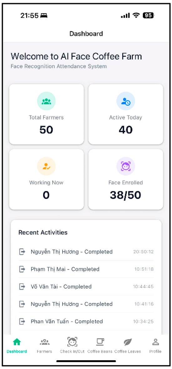 Agricultural mechanization and advanced technology have developed significantly in the coffee industry. However, there are still requirements for human laborers to operate, monitor crop health care, and manage production. The integration of advanced technology can significantly enhance the production efficiency and management practices of agricultural enterprises. This paper aims to address these gaps by proposing and implementing a computer vision-based attendance tracking system on mobile platforms that are suitable for the requirements and limitations of agricultural enterprises. First, the face detection process involves interpreting and locating facial structure. Next, the model transforms a photographic image of a human face into digital data based on the unique features and facial structure. We utilize the InsightFace model with the buffalo_l variant, as well as ArcFace with a ResNet backbone, as a facial recognition algorithm. After capturing a facial image, the system conducts a matching process against the existing database to verify identity. Finally, we implement a mobile application prototype on both iOS and Android platforms, ensuring accessibility for farm workers. As a result, our system achieved 95.2% accuracy on the query set, with an average processing time of <200 ms per image (including face detection, embedding extraction, and database matching). The system performs real-time attendance monitoring, automatically recording the entry and exit times of farm workers using facial recognition technology, and enables quick registration of new workers. Our work is expected to enhance transparency and fairness in the human management process, focusing on the coffee farm use case.