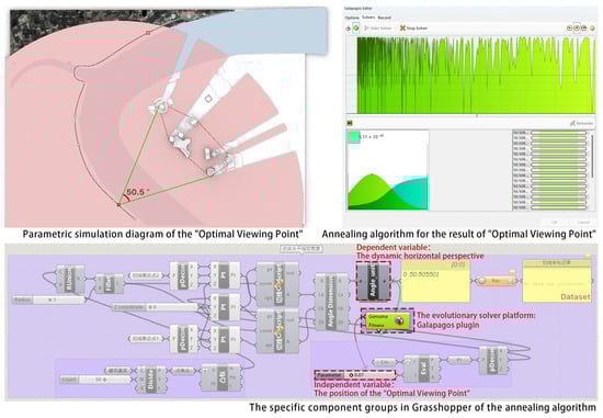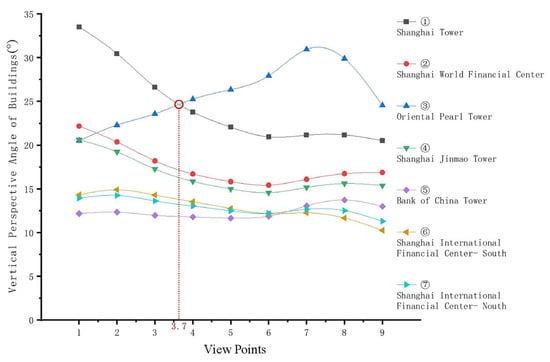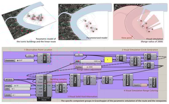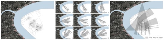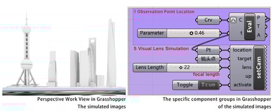 The external spatial form and skyline of high-density waterfront iconic building clusters in super-large cities are the most distinctive features of urban image. However, traditional static research methods (such as fixed-point photography) cannot capture the continuous visual experience of people in motion, thereby imposing obvious limitations. This study proposes a dynamic visual quantification method that constructs a linear observation path using the parametric platform Grasshopper. The method calculates two core parameters in real-time: the vertical perspective angle (θ, reflecting the building’s “sense of height”) and the horizontal perspective angle (β, reflecting the “sense of density” of the building cluster), so as to realize the dynamic and continuous quantification of the building cluster’s form. Using Shanghai Lujiazui as a case study, this paper validates the method’s effectiveness. The results show that the visual perception of buildings is not only determined by their absolute height but also influenced by the distance from the observation point and spatial relationships. Furthermore, through variance analysis and an annealing algorithm, this study can identify “visually stable points” (suitable for arranging core landmarks) and “optimal viewing points” (suitable for setting up urban viewing platforms). This method provides a reproducible quantitative tool and specific guidance for the optimization of waterfront building layouts and the planning of urban viewing platforms.
