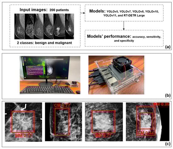 Background/Objectives: Breast cancer persists as a leading cause of female mortality globally. Mammograms are a key screening tool for early detection, although many resource-limited hospitals lack access to skilled radiologists and advanced diagnostic tools. Deep learning-based computer-aided detection (CAD) systems can assist radiologists by automating lesion detection and classification. This study investigates the performance of various You Only Look Once (YOLO) models and a Hybrid Convolutional-Transformer Architecture (YOLOv5, YOLOv8, YOLOv10, YOLOv11, and Real-Time-DEtection Transformer (RT-DETR)) for detecting mammographic lesions on an affordable embedded system. Methods: We developed a custom web-based annotation tool to enhance mammogram labeling accuracy, using a dataset of 3169 patients from Thailand and expert annotations from three radiologists. Lesions were classified into six categories: Masses Benign (MB), Calcifications Benign (CB), Associated Features Benign (AFB), Masses Malignant (MM), Calcifications Malignant (CM), and Associated Features Malignant (AFM). Results: Our results show that the YOLOv11n model is the optimal choice for the NVIDIA Jetson Nano, achieving an accuracy of 0.86 and an inference speed of 6.16 ± 0.31 frames per second. A comparative analysis with a graphics processing unit (GPU)-powered system revealed that the Jetson Nano achieves comparable detection performance at a fraction of the cost. Conclusions: The current research landscape has not yet integrated advanced YOLO versions for embedded deployment in mammography. This method could facilitate screening in clinics without high-end workstations, demonstrating the feasibility of deploying CAD systems in low-resource environments and underscoring its potential for real-world clinical applications.