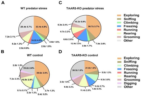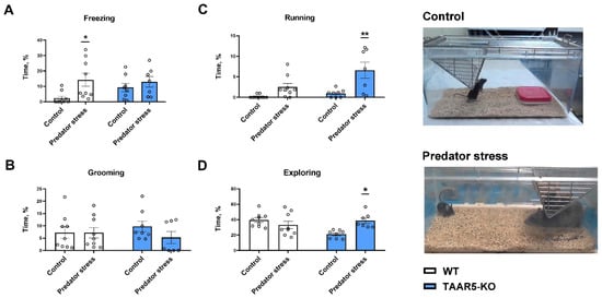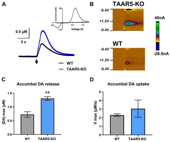 Recent studies indicated a connection between trace amine-associated receptor 5 (TAAR5) and emotional behaviors related to anxiety and depression; however, the neurobiological basis of this link is still unclear. Using mutant TAAR5 knockout (TAAR5-KO) mice, we explored the consequences of receptor deletion on dopamine (DA) dynamics in the ventral striatum and stress-related behaviors. Voltammetric measurements of DA in the nucleus accumbens (NAc) coupled with electrical stimulation of the ventral tegmental area (VTA) revealed that mice lacking TAAR5 display a greater DA release, while its reuptake is not affected. Behaviorally, mutants were significantly less anxious in the elevated plus maze (EPM) and consumed more sucrose in comparison with wild-type (WT) controls. The new object recognition test (NOR) did not uncover a difference between these genotypes. During predator (rat) stress exposure, mutant and WT mice showed quite distinct responses versus the behavior observed in stressless conditions. Control animals demonstrated a substantial increase in “freezing” (a sign of passive coping), while “running” and “exploring” patterns (signs of active coping) were significantly extended in mice lacking TAAR5. Short-term consequences of stress were explored 24 h following the predator exposure. The absence of TAAR5 did not prevent or reduce stress-induced anxiety in the EPM. In fact, the level of anxiety in mutants reached that observed in control mice. Furthermore, activity in NOR was significantly decreased in mice lacking TAAR5 but not in WT animals. On the other hand, predator exposure resulted in impaired NOR in the WT control, whereas mutants’ performance was not altered. These findings indicate that TAAR5 deletion leads to significant DA imbalance, which might at least partly explain the better stress-coping strategy and other stress-induced behavioral consequences observed in mutant animals.