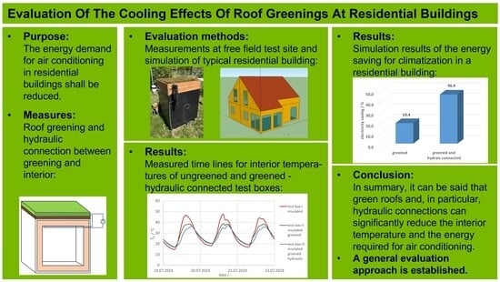 Within the scope of this article is the presentation of a modelling and measurement approach for the effects of roof greenings and the application of the approach to evaluate the influence of roof greenings upon the thermal conditions inside a typical residential building. It is shown that overheating in summer can be reduced, and thermal comfort for inhabitants can be increased. The cooling is caused by the transpiration of plants and by the evaporation of water from the substrate. Other relevant physical effects are the shading of plants and the increase in the heat capacity of the building. In state-of-the-art buildings, a layer with a high insulating effect is incorporated into the envelope. This leads to the effect that a huge fraction of the cooling power is taken from the outside of the building and only a smaller part is taken from the inside. In order to mitigate this decoupling, a hydraulic connection between the greening and the interior of the building is introduced. To evaluate the effect of the inside cooling, the difference in the number of yearly hours with overheating in residential buildings is estimated. In addition, the reduction in energy demand for the climatisation of a typical residential building is calculated. The used methods are as follows: (1) Performance of laboratory and free field measurements. (2) Simulation of a typical residential building, using a validated approach. In summary, it can be said that green roofs, in particular with hydraulic connections, can significantly increase the interior thermal comfort and potentially reduce the energy required for air conditioning.