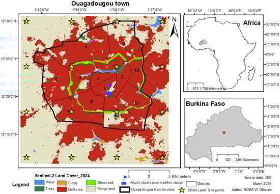 The West African Sahel suffered an unprecedented hot season during spring 2024 especially marked by noticeable heatwave episodes in the urban context of Burkina Faso’s capital, Ouagadougou, where significant impacts were reported. These heat events are analyzed to link hazards with impacts and improve early warning systems in the under-recognized Sahel context. Using observational data from the Burkina Faso National Meteorological Agency and the European reanalysis, ERA5, anomalies of both daily maximum (Tmax) and minimum (Tmin) temperatures were analyzed. The results show that, during the first half of 2024, monthly Tmax and Tmin anomalies were highly positive compared to the reference period 1991–2020. A total of four daytime and one nighttime heatwave events were detected. The longest daytime heatwave lasted six days with observed Tmax reaching 44.5 °C. The unique nighttime heatwave was at least twice as long as the longest daytime heatwave, persisting 13 days between late April and early May. In addition, the heat was not evenly distributed spatially as some districts were significantly hotter than the rest of the city, suggesting possible urban/local effects. These results underscore the occurrence of exceptional heat in 2024 and the need for efforts towards heatwave risk mapping and management in African cities.