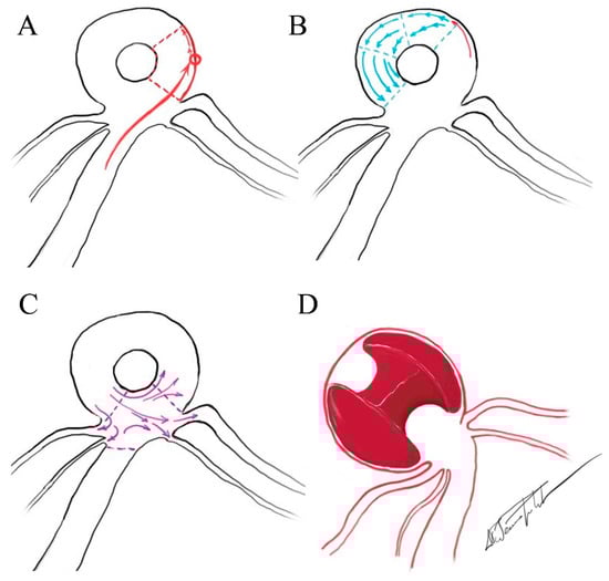 Background/Objectives: “Ring-like” intracranial aneurysms—historically described as “doughnut-like” or “donut sign”—represent a rare configuration in which a central thrombus coexists with a circumferential mural flow ring. Traditionally considered a radiologic curiosity, this morphology likely reflects a shear-driven hemodynamic state rather than a stable organized thrombus. Objective: We aimed to summarize all PubMed-documented cases of ring-like aneurysms, define their morphologic and clinical spectrum, and assess their hemodynamic significance, rupture risk, and treatment outcomes. An additional aim is to formalize the use of the term “ring-like aneurysm” as a distinct morphologic subtype and to clearly differentiate it from the neuroradiologic “donut sign,” which represents an imaging appearance rather than a specific anatomic configuration. Methods: A systematic PubMed search (1996–2024) was conducted using the following combinations of keywords and Boolean operators: (“ring-like aneurysm” OR “donut aneurysm” OR “doughnut aneurysm” OR “ring-shaped aneurysm” OR “circumferential lumen” OR “central thrombus”) AND (“intracranial” OR “cerebral” OR “basilar” OR “aneurysm”). Only English-language, PubMed-indexed reports describing true ring-like (donut-shaped) aneurysms were included. Non-indexed, non-English, and serpentine or fusiform aneurysms mimicking ring-like morphology were excluded. Extracted data included aneurysm location, size, presentation (ruptured, symptomatic, or incidental), treatment strategy, and clinical outcome. Statistical proportions were analyzed using descriptive methods, Wilson 95% confidence intervals, and a binomial test to compare the observed subarachnoid hemorrhage (SAH) rate against the expected conservative rupture proportion. Results: The search identified 16 individual patients reported in 10 publications. All aneurysms were large or giant (14–36 mm) displaying characteristic thrombosed pattern. Ruptured presentation occurred in 6 out of 16 cases (37.5%) and symptomatic unruptured in 10 (62.5%). No incidental cases were reported. Posterior circulation involvement was present in 44%, with a female predominance of 69%. Conclusions: Ring-like aneurysms constitute a distinct, shear-maintained hemodynamic entity combining mural jet flow with central thrombosis. Their frequent symptomatic or ruptured presentation supports the concept that this morphology represents a pre-ruptural configuration rather than a chronic thrombotic residue. Early recognition and targeted endovascular exclusion of the inflow zone are essential to prevent delayed rupture.