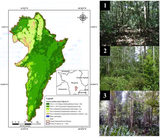 The northern Brazilian Amazon has ecological transition ecosystems with high diversity and endemism of tree species and few botanical collections. We evaluated the phytosociology between Dense Ombrophilous Forest (Ds) and Forested Campinarana (Ld) within Anauá National Forest in Roraima, Brazil. A total of 14,730 trees with a DBH ≥ 10 cm were inventoried across 30 hectares (ha), distributed among 55 botanical families, 183 genera, 386 species, and 123 undetermined trees. Ten hyperdominant tree families accounted for 69% of the sampled trees and 65% of the stored forest carbon (102.9 ± 5.0 Mg ha−1), like Arecaceae (2555 trees), Fabaceae (1738 trees), and Sapotaceae (1311 trees). Ten hyperdominant species accounted for 32% of the sampled individuals and 32% of the stored forest carbon (46.3 ± 3.8 Mg ha−1), like Euterpe precatoria (1151 trees), Pouteria macrophylla (561 trees) and Inga alba (574 trees). Anauá National Forest has great potential for sustainable multiple-use forest management through forest concessions; however, tree mortality due to natural causes and anthropogenic actions (deforestation, illegal selective logging, and forest fires) was considered high (7%) for tropical forests in the Amazon.