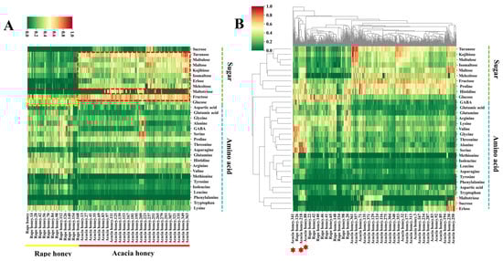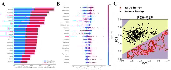 Honey variety authentication is critical for ensuring market integrity and protecting consumer rights, especially for high-value unifloral honeys, such as acacia honey, which are frequently adulterated with low-value alternatives such as rape honey due to their similar visual appearance. The aim of this study was to develop a method for precise discrimination between rape honey and acacia honey using their chemical profiles combined with machine learning. A total of 542 honey samples were collected from major beekeeping regions in China. Targeted quantification of 12 sugars and 20 amino acids was performed using UPLC-MS/MS. Multivariate analysis revealed significant differences in sugar and amino acid compositions between the two honey types, though partial samples overlapped due to chemical similarity. Six machine learning algorithms, including the Multilayer Perceptron, were employed for classification. Optimization was performed via 10-fold cross-validation and ADASYN oversampling, yielding optimal performance of 98% and 100% prediction accuracies for rape honey and acacia honey, respectively, on the independent test set. SHAP (Shapley Additive Explanations) analysis identified key differential markers, including fructose, turanose, glucose, and GABA, which contributed most to the classification. Furthermore, a user-friendly web application was developed to facilitate rapid on-site authentication. This study provides an innovative technical framework for honey variety discrimination, with potential applications in quality control and anti-fraud practices.