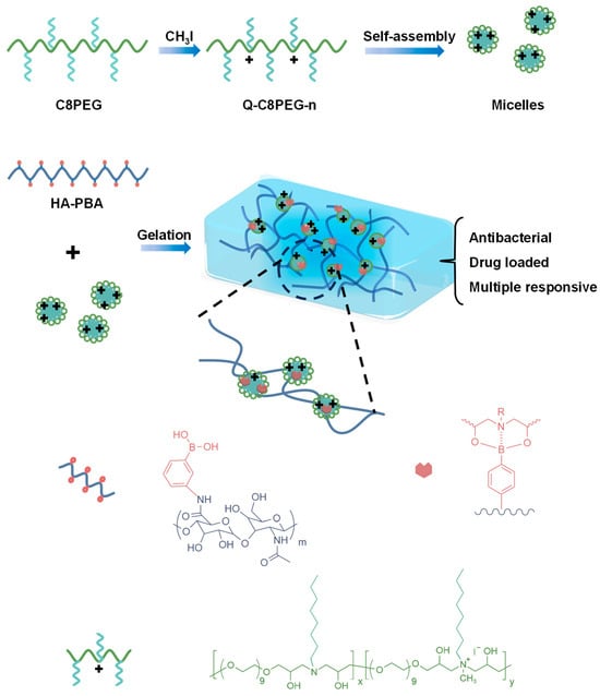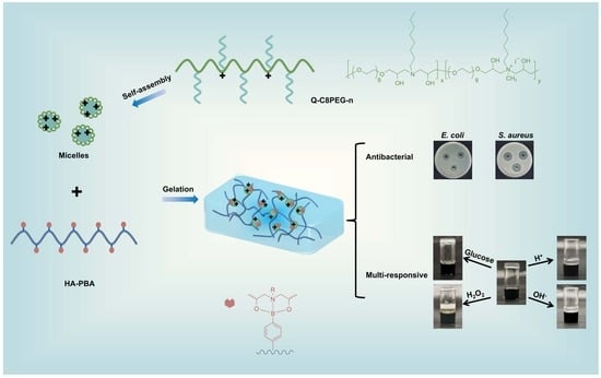 Dynamic covalent hydrogels exhibiting multi-responsive and antibacterial properties offer significant potential for biomedical applications, including smart wound dressings and controlled drug delivery. Herein, a series of amphiphilic quaternized copolymers (Q-C8PEG-n) with tunable quaternization degrees was synthesized from C8PEG via iodomethane addition and characterized by 1H NMR, COSY, FTIR, UV-vis spectroscopy, DLS, TEM, and zeta potential analyses, confirming successful quaternization and micelle formation. These copolymers displayed thermosensitive behavior, with cloud point temperatures increasing due to enhanced hydrophilicity. Q-C8PEG-3 micelles, incorporating diethanolamine units, were crosslinked with phenylboronic acid-grafted hyaluronic acid (HA-PBA) to yield dynamic covalent hydrogels (Gel) through reversible boronic ester bonds stabilized by B-N coordination. The Gel exhibited multi-responsiveness, undergoing degradation in acidic or alkaline conditions and exposure to glucose or H2O2. SEM confirmed a porous microstructure, enabling efficient drug encapsulation, as demonstrated by the release of Nile red (NR). In vitro antibacterial tests revealed enhanced post-quaternization efficacy, with the Gel showing strong activity against S. aureus. This micelle-crosslinked platform synergistically combines tunable stimuli-responsiveness with inherent antibacterial properties, holding promise for applications in wound healing and tissue engineering.