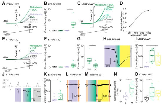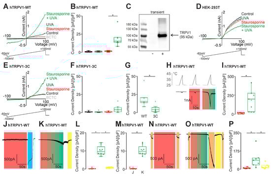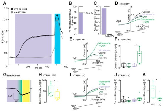 The activation of TRPV1 and TRPA1 by UVA light is a complex process involving channel modulation by reactive oxygen species (ROS). The present study describes staurosporine and midostaurin, two protein kinase inhibitors, as photosensitizers that can modulate the activity of TRPV1 and TRPA1