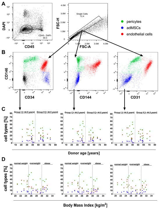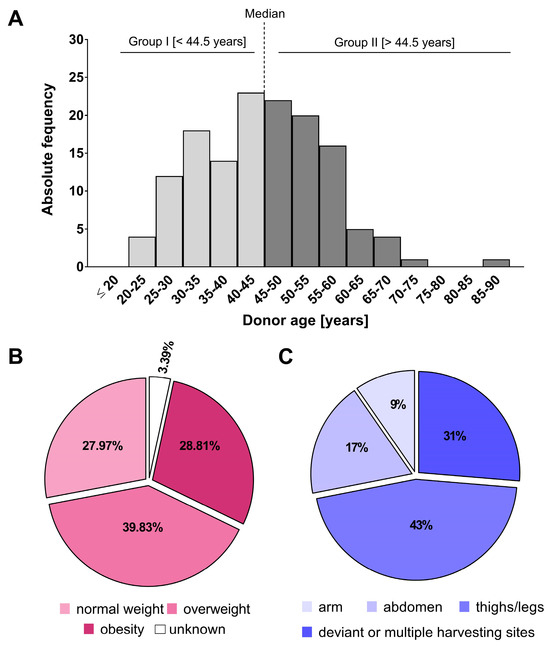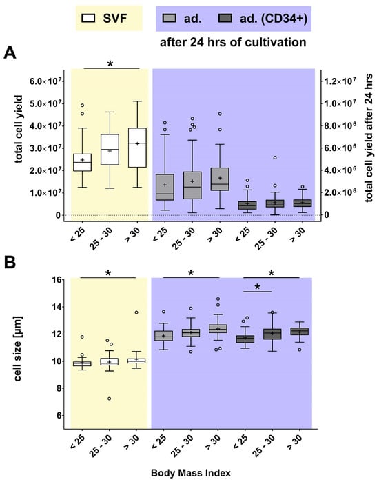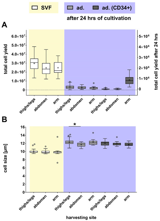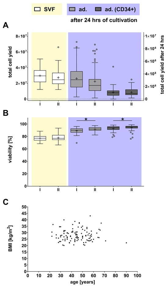Adipose tissue includes various cell types beyond the typical adipocytes. The stromal vascular fraction (SVF) contains mesenchymal stem cells (MSCs), pericytes, and endothelial cells, which can be isolated from adipose tissue by mechanical and enzymatic methods. The composition of the SVF is heterogeneous, and donor factors such as sex, age, body mass index (BMI), and harvesting site are associated with variations in cellular composition and viability. The expression of specific surface markers, which determine the immunophenotype of the cells, can also vary. In this study, we investigated the effects of donor age, BMI, and harvesting site on cell yield, viability, and size. Our results showed that BMI significantly influenced cell yield and size, with overweight and obese donors yielding more cells than normal-weight donors. Additionally, cells isolated from the adipose tissue of the thighs/legs were larger than those from other areas. Flow cytometry showed considerable variability in SVF composition among donors. These results emphasize that SVF donor characteristics have a significant impact on cell yield, viability, and cell size, with the immunophenotype being highly donor-dependent. Understanding these factors is crucial for optimizing cell yield and defining populations for therapeutic applications of SVF cells.
