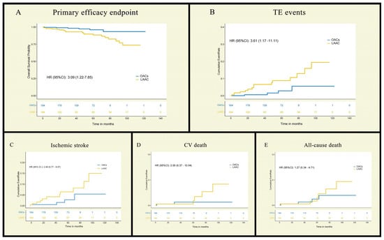Background and objective: Evidence of percutaneous left atrial appendage closure (LAAC) and oral anticoagulants (OACs) in non-valvular atrial fibrillation (NVAF) patients with intermediate-to-borderline high stroke risk is scarce. We aimed to compare the efficacy and safety of these treatments in the latter clinical population. Methods: This retrospective cohort study included NVAF patients with CHA2DS2-VA scores of 1–2 and used 1:1 propensity score matching (184 patients per group) to compare efficacy and safety outcomes. The primary efficacy outcome was a composite of stroke, transient ischemic attacks, systemic embolism, and cardiovascular death during follow-up. Adverse safety events were categorized into peri-procedure (LAAC group) and non-procedural (both groups) events. Results: Over a mean follow-up of 48.93 ± 28.50 months, a total of 26 patients (7.07%) reached the primary composite efficacy endpoint. The LAAC group showed a significantly higher incidence of the efficacy endpoint compared to the OAC group (HR = 3.09; 95% CI 1.22–7.85; log-rank p = 0.01). Procedure-related events occurred in five LAAC patients (one contributing to primary endpoint), while non-procedural bleeding rates were similar (0.54% vs. 1.09%; p = 0.56). Subgroup analyses suggested concomitant ablation of NVAF in LAAC group did not significantly improve efficacy composite endpoints (HR = 0.47). Conclusions: In NVAF patients with intermediate-to-high stroke risk, OACs were more effective than LAAC in preventing thromboembolic events, with comparable rates of clinically relevant bleeding.
