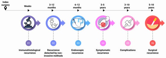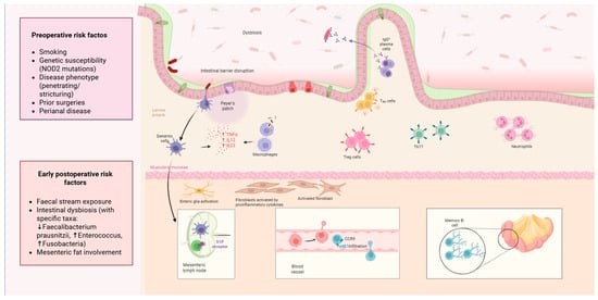 Postoperative recurrence (POR) remains a significant challenge in Crohn’s disease (CD) management despite therapeutic advances. Contemporary data show ileocecal resection rates of 18.7%, 28.0%, and 39.5% at one, five, and ten years after diagnosis, with endoscopic recurrence occurring in 22.4–53% of patients within