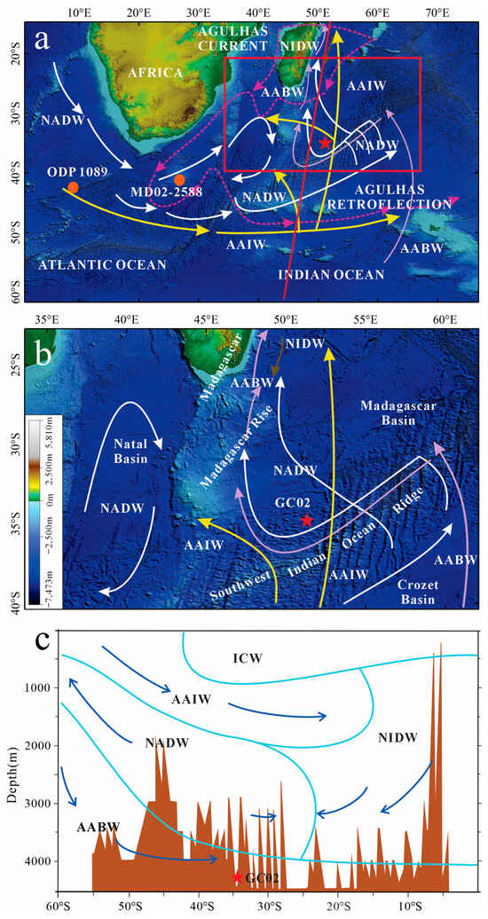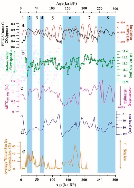 Benthic δ18O and δ13C values, as well as the mean grain size (MS) of sortable silt (SS), were used to construct the records of deep-water ventilation during the last 300 ka, at core GC02. This core is located at 4430 m water depth on the Madagascar basin near the Southwest Indian Ocean mid-ridge (SWIR). Decreased values of MS of SS reveal a weakened Antarctic Bottom Water (AABW) in the glacial periods, while increased values indicate enhanced AABW in the interglacial periods. The MS of SS record in GC02 exhibited a particularly good synchronization with a record based on the δ13C gradient between the North Atlantic and tropical Pacific Ocean, indicating that AABW is dominated by the overturning strength of the Atlantic meridional overturning circulation (AMOC), and showed a higher generation rate in the early stages of the glacial periods. A rapid reduction in δ13C occurred in MIS 2, 4, and 6; the MS values in GC02 and winter sea ice (WSI) also exhibited significant decreases and increases, respectively. By controlling the transport of ventilated water mass to deep waters and polar heat transport, in the Indian Ocean, both the change in AABW intensity and the Southern Ocean ice volume result from changes in the AMOC under the orbital modulation background. In the Southwest Indian Ocean, AMOC has a larger effect on ice volume during glacial periods, while its effect on AABW is relatively strong during interglacial periods.