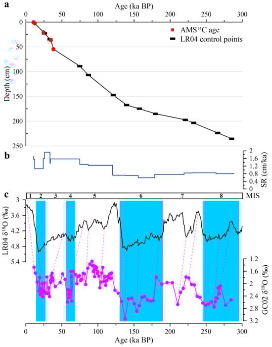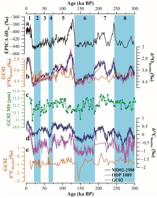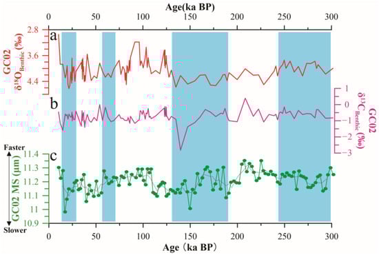 Benthic δ18O and δ13C values, as well as the mean grain size (MS) of sortable silt (SS), were used to construct the records of deep-water ventilation during the last 300 ka, at core GC02. This core is located at