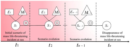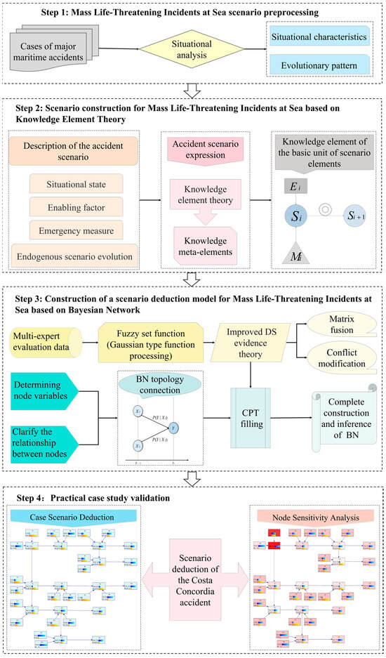 The growth of the cruise industry and rising passenger numbers have led to an increase in cruise-related accidents, presenting challenges for mass rescue operations. It is crucial to understand the evolution of MAss Life-Threatening Incidents at Sea (MALTISs) in order to make effective decisions in such situations. This study, therefore, presents a scenario deduction model for MALTIS, integrating knowledge element theory, Bayesian Networks (BNs), fuzzy set theory, and improved Dempster–Shafer (DS) evidence theory. Based on knowledge element theory, this study identifies the scenario elements in typical maritime accidents. Given the large scale and complex disaster chain characteristics of MALTISs, the BN method is employed to convert the scenario elements into BN nodes, therefore constructing the MALTIS deduction model. To minimize the subjectivity associated with expert assessments, this study combines fuzzy set theory and the improved DS evidence theory to integrate the opinions of multiple experts, thereby enhancing the reliability of the model’s deduction. BN inference is then used to calculate the probabilities of various situational states, and sensitivity analysis is conducted to identify the key nodes. The Costa Concordia grounding incident serves as an empirical case study. The deduction results closely align with the actual accident evolution, and sensitivity analysis reveals five critical nodes in the event’s progression. This validates the effectiveness of the proposed scenario deduction model. These findings demonstrate that the model can effectively support emergency decision-making in MALTISs.
