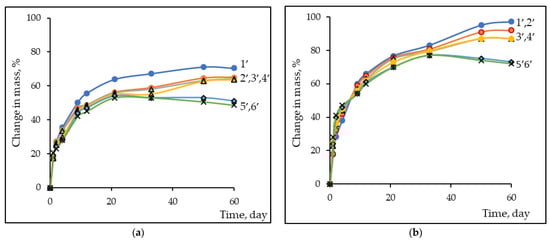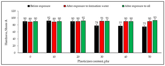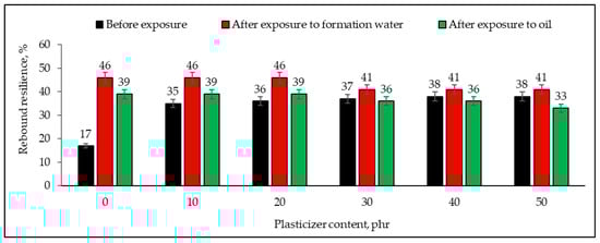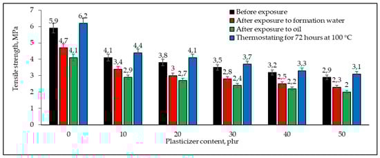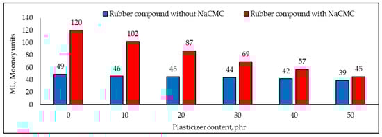 The stability of physical and mechanical properties of highly filled swelling rubbers in polar and nonpolar liquids (oil, mineralized water) was studied. Nitrile butadiene rubber of BNKS-28 AMN grade served as the elastomer matrix, with sodium salt of carboxymethylcellulose (NaCMC) as the swelling filler. Oxal T-92, a mixture of dioxane alcohols (10–50 phr, step 10 phr), was used as a plasticizer due to its good thermodynamic miscibility with rubber (confirmed by Scatchard–Hildebrand calculations). Adding Oxal T-92 to NaCMC-filled compounds markedly reduced Mooney viscosity, improving processing through increased macromolecule mobility, without significantly affecting vulcanization kinetics—indicating chemical inertness toward crosslinking centers. Increasing Oxal T-92 from 10 to 50 phr reduced tensile strength from 4.1 MPa to 2.9 MPa. Swelling in aqueous solutions of varying mineralization was evaluated via volume and mass change. The optimal plasticizer content for high swelling with acceptable strength is 20–30 phr. After 3 days in oil and formation water, NaCMC-filled rubbers retained stable physical and mechanical properties.