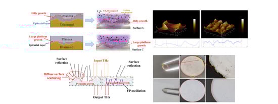 The single-crystal diamond (SCD) possessing both favorable dielectric properties and low stress is esteemed as the ideal material for terahertz windows. The intrinsic step-like growth pattern of SCD can easily lead to stress concentration and a decrease in dielectric performance. In this study,