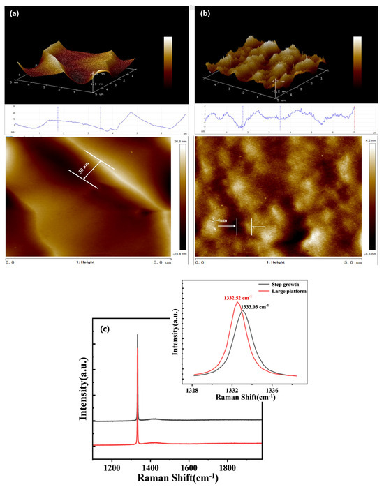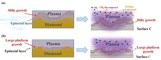 The single-crystal diamond (SCD) possessing both favorable dielectric properties and low stress is esteemed as the ideal material for terahertz windows. The intrinsic step-like growth pattern of SCD can easily lead to stress concentration and a decrease in dielectric performance. In this study, a “two-step method” was designed to optimize the growth mode of SCD. A novel large platform growth pattern has been achieved by controlling diamond seed crystal etching and the epitaxial layer growth process. The experimental results indicate that, compared with the traditional step-like growth model, the root mean square (RMS) roughness of as-prepared SCD reduced from 5 nanometers (step growth) to 0.4~1.0 nanometers (platform growth) within a 5 μm × 5 μm area. Furthermore, the growth step height difference diminished from 30 nm to 3~4 nm, thereby mitigating stress induced by steps to a mere 0.1976 GPa. Additionally, at frequencies ranging from 0.1 to 3 THz, the diamond windows exhibit lower refractive index, dielectric constant, and dielectric loss. Finally, large platform growth effectively reduces phenomena such as dislocation pile-up brought about by step growth, achieving low-damage ultra-precision machining of diamond windows measuring 1 mm in diameter.