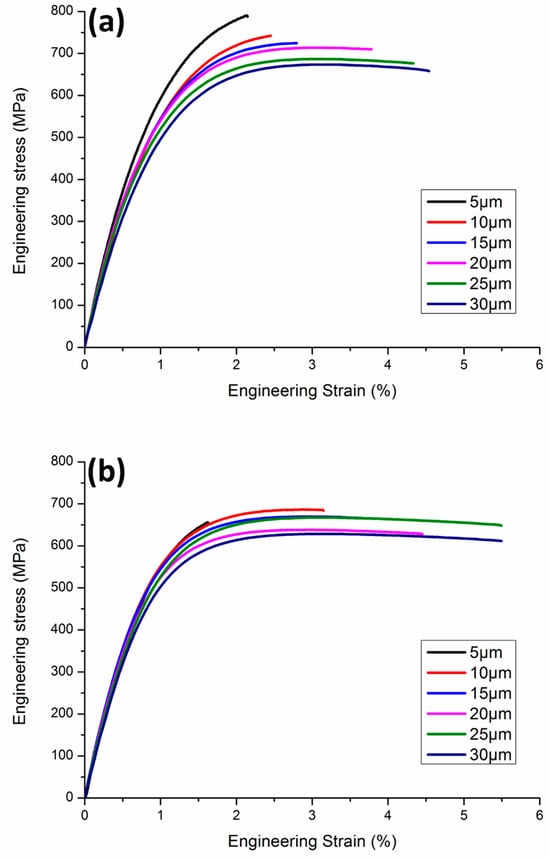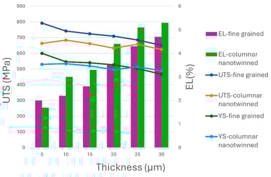 This study systematically investigates the thickness-dependent mechanical properties of electroplated copper foils with fine-grained (FG-Cu) and columnar nanotwinned (NT-Cu) microstructures. Tensile testing across a thickness range of 5–30 μm revealed that NT-Cu exhibits superior mechanical stability, with significantly lower reductions in both ultimate tensile strength (UTS) and yield strength (YS) compared to FG-Cu. The UTS of the 30 μm thick FG-Cu foil was measured at 651 MPa, increasing to 792 MPa at a thickness of 5 μm. In contrast, the UTS of NT-Cu foils only rose from 624 MPa at 30 μm to 663 MPa at 5 μm. A similar trend was observed for the YS. Microstructural analysis confirmed that NT-Cu maintains a stable columnar grain structure with minimal grain growth, contributing to its resistance to thickness-induced strength loss. These findings highlight NT-Cu as a promising candidate for applications requiring consistent mechanical performance across varying foil thicknesses.