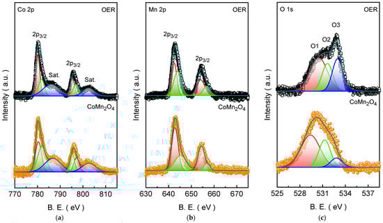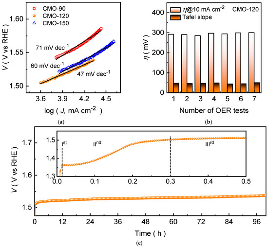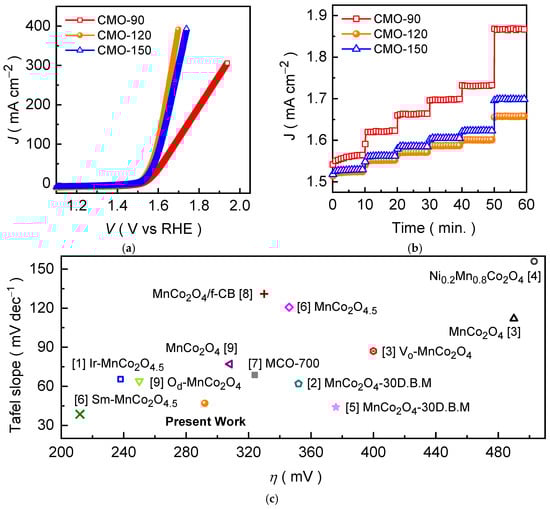 The development of efficient and durable oxygen evolution reaction (OER) catalysts from earth-abundant materials is essential for advancing alkaline water electrolysis. Herein, nanograss-like CoMn2O4 electrode films are directly grown on stainless-steel substrates via a temperature-controlled hydrothermal approach, and their OER performance is systematically investigated. The CoMn2O4 obtained at 120 C (CMO-120) delivers the best catalytic activity in 1.0 M KOH, requiring an overpotential of 292 mV at 10 mA cm−2, which is lower than those synthesized at 150 (CMO-150) and 90 C (CMO-90). Notably, activity of CMO-120 becomes even more pronounced at elevated current densities, achieving the low overpotential of 434 mV even at 300 mA cm−2, substantially outperforming both CMO-90 and CMO-150 electrodes. The enhanced activity is attributed to an interconnected nanograss architecture with mixed Co2+/Co3+ and Mn2+/Mn3+ redox couples and abundant defect-related oxygen species, which result in increased electrochemically active surface area and improved charge transportation throughout the nanograss architecture that facilitate OH− adsorption and OER intermediate transformation. Furthermore, CMO-120 demonstrates excellent durability (100 h) after electro-oxidation-induced surface activation. These findings highlight precise temperature regulation as an effective strategy for optimizing Mn-Co spinel for efficient alkaline OER applications.