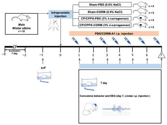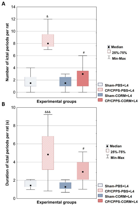 Background and Objectives: Chronic prostatitis/chronic pelvic pain syndrome (CP/CPPS) is a complex disease that involves changes in multiple organs and even the central nervous system (CNS). CP/CPPS may elevate seizure risk via neuroinflammatory mechanisms within the CNS. Neuroprotective effects of CO-releasing molecules (CORMs) were demonstrated in inflammation-driven conditions, while CORMs potential to ameliorate seizure susceptibility in inflammatory states, like CP/CPPS, remains unclear. Therefore, we investigated effects of CORM-A1 on susceptibility to lindane–induced seizures in rats with CP/CPPS through behavioral and electroencephalographic (EEG) study. Materials and Methods: Wistar rats were divided into four groups (n = 8/group): Sham-PBS, Sham-CORM, CP/CPPS-PBS and CP/CPPS-CORM. The CP/CPPS model was created by injection of 3% λ-carrageenan and its development assessed by mechanical pain threshold. CORM-A1 (2 mg/kg/day, i.p.) or vehicle (PBS) was given during seven postoperative days. Hereupon, subconvulsive dose of lindane (4 mg/kg, i.p.) was administered and behavioral features of seizures were observed alongside with EEG recordings. Results: Our data showed that the incidence and severity of lindane-induced seizures was significantly higher in the CP/CPPS-PBS group than in the Sham-PBS group. CORM-A1 treatment significantly decreased seizure incidence, prolonged seizure latency, and reduced seizure severity in CP/CPPS rats compared to vehicle treatment (CP/CPPS-CORM vs. CP/CPPS-PBS). Also, CORM-A1 treatment significantly reduced the number and duration of ictal periods induced by lindane in CP/CPPS animals compared to vehicle treatment. Conclusions: It could be concluded that CORM-A1 treatment reduced both behavioral and EEG signs of increased seizure susceptibility in rats with CP/CPPS, thus it could be a potential therapeutic target.
