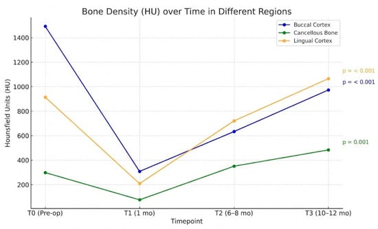 Background and Objectives: This study aimed to assess the pattern and quantity of bone regeneration after mandibular setback surgery using a novel modification of the low Z plasty (NM-Low Z plasty) technique by measuring bone density (Hounsfield unit) at the osteotomy site over a 12-month postoperative period using cone-beam computed tomography (CBCT). Materials and Methods: This retrospective cohort study included six patients with skeletal Class III deformity who underwent bilateral sagittal split osteotomy (BSSO) setback using the NM-Low Z plasty technique between 2021 and 2023 at Thammasat University Hospital. CBCT images were obtained preoperatively and at 1 month, 6 months, and 12 months postoperatively. Bone density at the buccal, cancellous, and lingual aspects of the osteotomy gap was measured using Blue Sky Plan 4 software. The intraclass correlation coefficient was used to determine reliability. Descriptive statistics, repeated-measures analysis of variance and multiple linear regression analysis were performed for comparisons. Results: At 12 months postoperatively, bone density in all measured regions was not significantly different compared to the postoperative measurements, indicating sufficient bone regeneration. The cancellous and lingual cortical regions exhibited earlier recovery than the buccal cortex. No postoperative complications such as wound infection, delayed union, or non-union were reported. Conclusions: BSSO using the NM-Low Z plasty technique offers reliable bone healing outcomes with stable bone regeneration, thereby providing a viable alternative to conventional BSSO techniques. Radiographic evidence confirmed its clinical applicability and potential to reduce the incidence of postoperative complications.