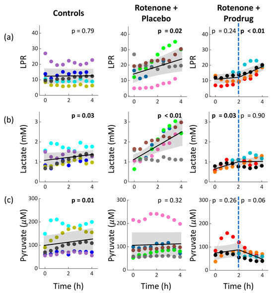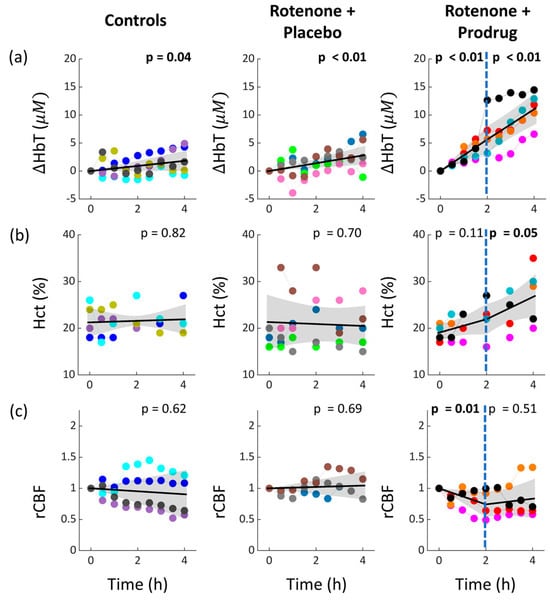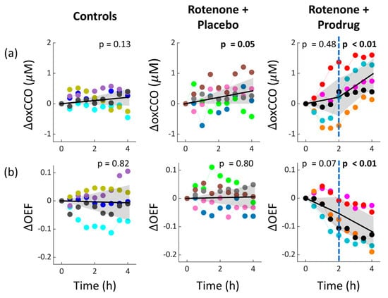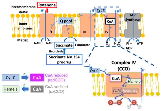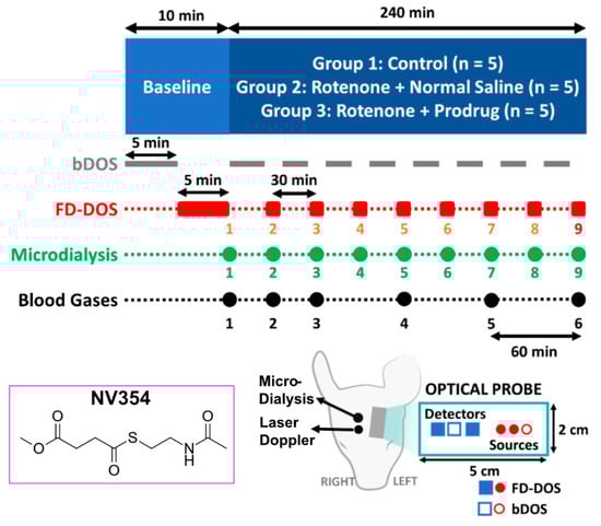 Background/Objectives: Mitochondrial dysfunction is a major cause of brain injury in patients with primary mitochondrial disease. New mitochondrial therapeutics and non-invasive tools for efficacy monitoring are urgently needed. To these ends, succinate prodrug NV354 (methyl 3-[(2-acetylaminoethylthio)carbonyl]propionate) and diffuse optical techniques are promising. In this proof-of-concept study, we characterize NV354’s effects on microdialysis metrics of cerebral metabolism in a swine model of mitochondrial dysfunction and assess the associations of diffuse optical metrics with mitochondrial dysfunction and metabolic improvement. Methods: One-month-old swine received a four-hour co-infusion of rotenone with either the succinate prodrug NV354 (n = 5) or placebo (n = 5). Rotenone is a mitochondrial complex I inhibitor. Before and during co-infusion, cerebral metabolism was probed with microdialysis and diffuse optics. Microdialysis acquired interstitial lactate and pyruvate levels invasively, while diffuse optics measured changes in oxygen extraction fraction (OEF) and oxidized cytochrome-c-oxidase concentration (oxCCO). Results: Interstitial lactate continually increased in the placebo group (p < 0.01), but lactate levels plateaued in the NV354 group (p = 0.90). oxCCO also increased in the placebo group (p = 0.05), but OEF remained constant (p = 0.80). In the NV354 group, oxCCO increased (p < 0.01) while OEF decreased (p < 0.01). Conclusions: Microdialysis results suggest that NV354 treatment can increase oxygen metabolism in large animals with mitochondrial dysfunction. The optical oxCCO metric was also sensitive to metabolic changes induced by rotenone and NV354 administration.