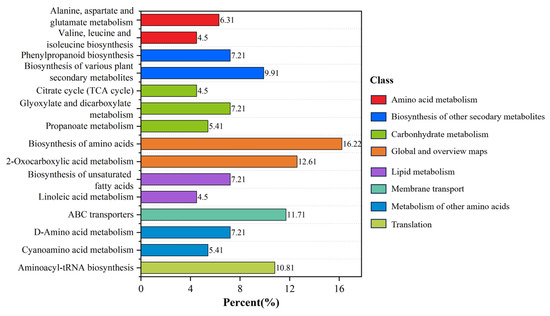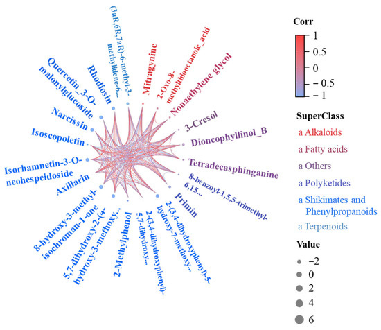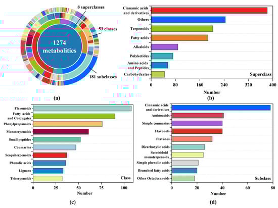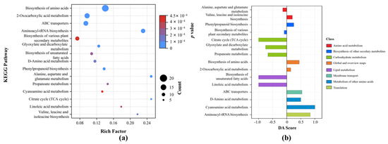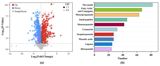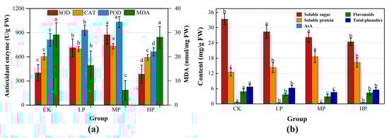 Background: Non-jointed water dropwort (Oenanthe javanica (Blume) DC.) is a widely cultivated aquatic vegetable with notable nutritional and pharmacological properties. Phosphorus (P) is a key nutrient affecting plant growth, photosynthesis, and metabolic balance, yet its role in water dropwort remains understudied. Methods: This study investigated the physiological and metabolic responses of non-jointed water dropwort under P-deficiency treatment (0 mg·L−1) and increasing P supply levels (5, 10, and 30 mg·L−1). Results: Moderate P supply (10 mg·L−1) significantly promoted plant growth, enhanced photosynthetic efficiency, and increased antioxidant enzyme activity, increasing by 55.9%, 20.2%, and 118%, respectively, compared with the P-deficiency treatment. High P levels (30 mg·L−1) inhibited growth and induced oxidative stress. Untargeted metabolomic analysis was conducted on root samples from CK (0 mg·L−1) and HP (30 mg·L−1) groups using UHPLC-MS. A total of 1274 metabolites were identified, with flavonoids, phenylpropanoids, fatty acid and conjugates being predominant. A total of 842 differential metabolites were screened under HP stress, with flavonoids (e.g., narcissin) showing the most significant upregulation. KEGG enrichment revealed key pathways including biosynthesis of amino acids, ABC transporters, and aminoacyl-tRNA biosynthesis, indicating metabolic reprogramming under HP stress. Notably, flavonoid and terpenoid pathways were upregulated, while certain lipid metabolism pathways, including fatty acid conjugates and phenylpropanoids, were downregulated. These findings suggest that non-jointed water dropwort adapts to high P stress by activating defense-related secondary metabolism and adjusting carbon–nitrogen allocation. Conclusions: This study provides a theoretical basis for P management and stress-resistant cultivar selection in non-jointed water dropwort.