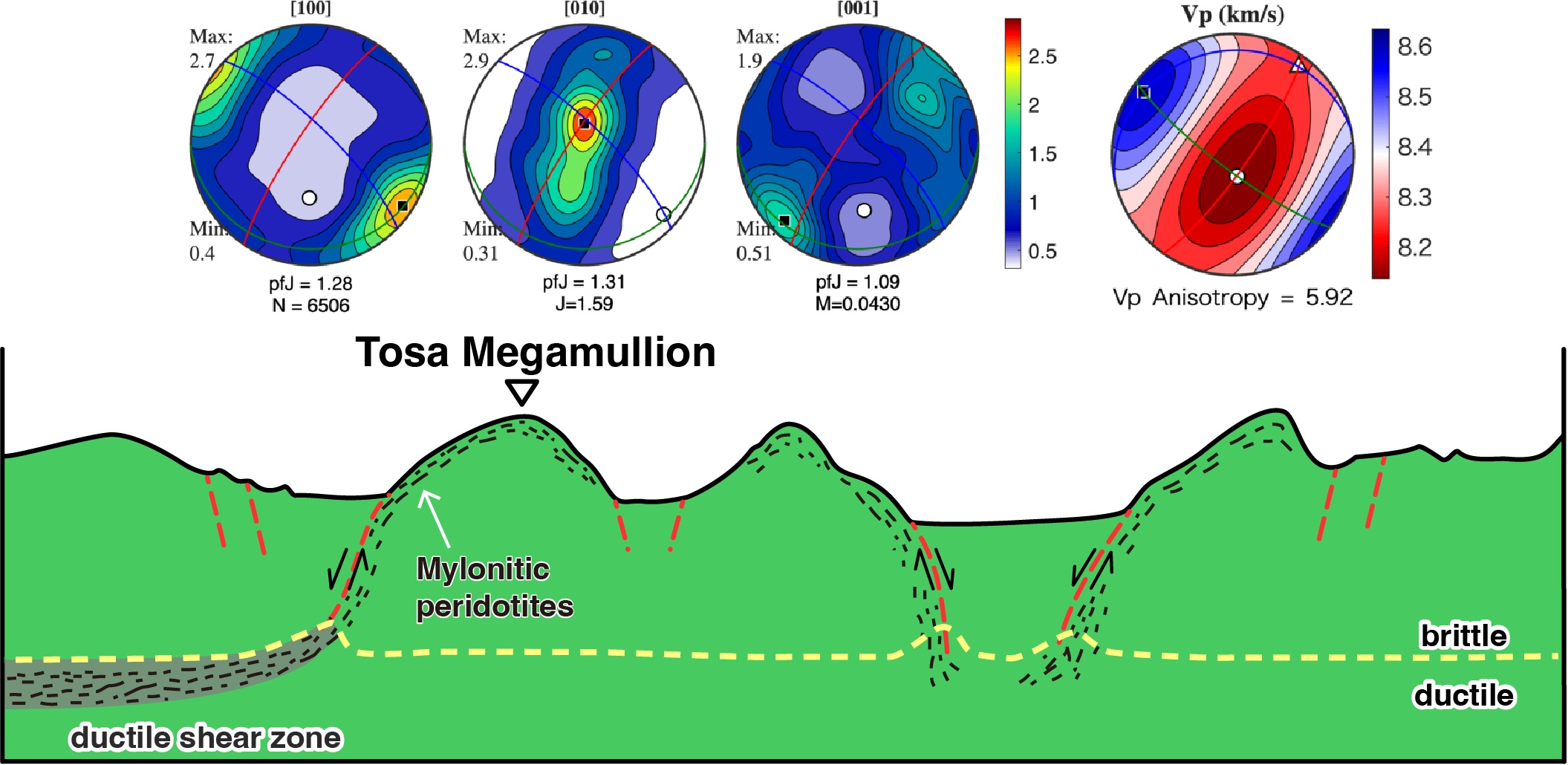Mylonitic mantle peridotites exposed at the Tosa Megamullion in the Shikoku Basin, Philippine Sea, provide direct evidence for amagmatic ductile shear deformation of the upper mantle beneath a back-arc spreading center. Oceanic core complexes (OCCs), or megamullions, are dome-shaped structures formed by detachment