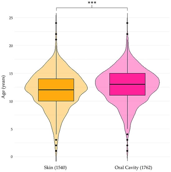This retrospective study provides an extensive evaluation of feline squamous cell carcinoma (SCC), comparing oral and cutaneous SCC, as well as different oral/cutaneous sites, with respect to sex, age, breed, and coat length. It was based on 4300 SCCs submitted to LABOKLIN GmbH & Co. KG from 2017 to 2023. No sex predisposition was identified. Affected cats were predominantly older (median age 13 years). SCC risk increased with age, although cats of very young age were also affected. Breed predispositions were not found. However, compared to non-pedigree cats, Persians, Norwegian Forest Cats, British Shorthairs (BSH), Chartreux, and Siamese cats showed a reduced risk, as did longhaired cats. The predominant sites were the oral cavity (41.0%, 1762/4300) and skin (35.8%, 1540/4300). Maine Coons, BSHs, Persians, and Norwegian Forest Cats, as well as longhaired cats, developed oral SCC more frequently. Intraoral, gingival (36.2%, 637/1762) and lingual (19.0%, 334/1762) SCC predominated. Common cutaneous sites included the pinnae (35.0%, 539/1540), unspecified head/neck regions (8.8%, 135/1540), and the nose (8.7%, 134/1540). Maine Coons and BSHs showed less auricular SCC; Sphynx had more on the trunk. These findings emphasise SCC as a crucial differential diagnosis for oral and cutaneous lesions, even in young cats.