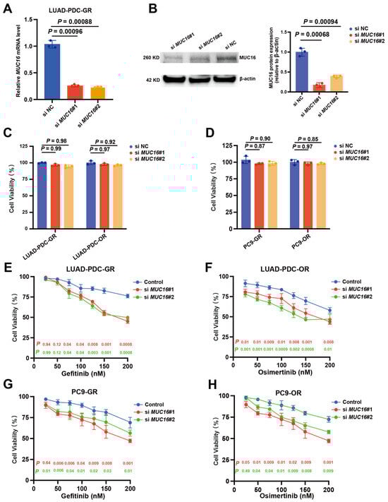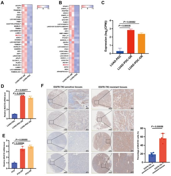 Background/Objectives: Acquired resistance to epidermal growth factor receptor (EGFR)-tyrosine kinase inhibitors (TKIs) remains a major challenge in the treatment of EGFR-mutant lung adenocarcinoma (LUAD). This study aimed to develop and characterize representative models of acquired EGFR-TKI resistance and to identify potential therapeutic targets mediating this process. Methods: Resistant models of PC9 and LUAD-PDCs were generated using a standardized dose-escalation protocol. The resulting models were characterized by drug response assays, morphology, and transcriptomic sequencing. Candidate target genes were validated across all resistant models using siRNA knockdown followed by re-sensitization assays. Clinical relevance was further examined through analysis of publicly available datasets. Results: These generated models displayed stable resistant phenotypes and unique transcriptomic alterations. Cross-model analysis revealed MUC16 as a consistently upregulated gene associated with resistance. Functional validation demonstrated that MUC16 depletion re-sensitized all resistant models to EGFR-TKIs. Furthermore, analysis of clinical data linked high MUC16 expression to poorer patient outcomes. Conclusions: This study establishes stable in vitro models for investigating acquired resistance in EGFR-mutant LUAD and identifies MUC16 as a functionally validated and clinically relevant mediator of EGFR-TKI resistance, providing a potential therapeutic target for overcoming drug resistance.