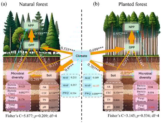 While climate is known to regulate forest productivity, the mechanistic contribution of soil microbial communities—and whether it differs between natural and plantation forests—remains poorly quantified at broad scales. Here, we provide a synthesis-level, unified analysis that jointly evaluates climate, edaphic conditions, and soil