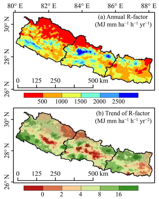 Nepal is highly vulnerable to severe soil erosion driven by monsoonal rainfall and rugged terrains. Limitations in ground observation networks have hindered comprehensive, high-resolution national assessment of precipitation and rainfall-runoff erosivity (R-factor) across Nepal. This study systematically evaluated eight global gridded precipitation datasets (GPDs) against data from 152 weather stations, identifying the optimal precipitation dataset (TPHiPr) representing Nepal’s complex topography. Based on this high-quality dataset, we provided the first independent, long-term (1979–2020), high-resolution national-scale assessment of precipitation and the R-factor for Nepal. Our analysis reveals that 1996 marked a turning point in nationwide precipitation trends: annual precipitation shifted from a decreasing to an increasing one in the humid eastern and central regions, while the drier western region transitioned from an increasing to a decreasing trend, particularly during the dry season. A clear spatial divergence was observed between total precipitation and the R-factor, highlighting the dominant role of precipitation frequency and intensity. Extreme precipitation events intensified significantly (e.g., days with ≥25 mm rainfall increased by 0.2 days yr−1, and the 95th percentile precipitation threshold increased by 0.4 mm yr−1, p < 0.01), driving a nationwide increase in the R-factor (6.3 MJ mm ha−1 h−1 yr−2, p < 0.01), with high-altitude areas experiencing the most pronounced effects. We conclude that soil erosion risk has intensified nationwide due to increasing precipitation extremes. Watershed management must develop elevation-specific adaptation strategies that integrate climate science with practical solutions to address the dual challenges of intensified monsoon-driven erosion and growing dry-season water scarcity.