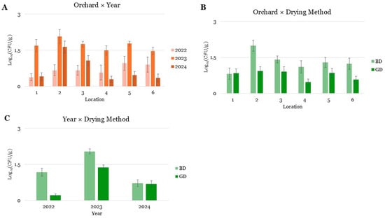 Hazelnut (Corylus avellana L.) is a major crop in the Caucasus region, but its safety is often threatened by Aspergillus flavus colonization and aflatoxin (AF) contamination. Although AFs are strictly regulated in the EU, the influence of post-harvest practices on fungal persistence and AF accumulation remains poorly defined. A three-year study was conducted to evaluate the effects of drying protocols, storage temperature, and conservation practices on fungal growth and AF occurrence in hazelnuts from three producing regions of Azerbaijan. Freshly harvested nuts were subjected to two drying regimes: good drying (sun-exposed, mixed, protected from rewetting) and bad drying (shaded, piled, rewetted). After drying, samples were stored at cold (8–10 °C) or room temperature (18–22 °C). Fungal prevalence was determined by CFU counts with morphological and qPCR identification of Aspergillus section Flavi. AFs were quantified by HPLC, and water activity (aw) was monitored during storage. Drying emerged as the decisive factor: bad drying consistently resulted in markedly higher fungal loads for A. section Flavi, with mean counts up to 1.5 × 102 CFU/g, compared with 2.1 × 101 CFU/g under good drying, representing a 7-fold increase. In contrast, storage temperature and shell condition had negligible effects when nuts were properly dried. Aflatoxins were consistently below the 5 µg/kg EU limit for AFB1 in traced and well-dried samples, whereas market samples occasionally exhibited AFB1 concentrations >450 µg/kg. These findings highlight drying efficiency as the key determinant of fungal persistence and AF risk in hazelnut post-harvest management.