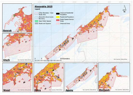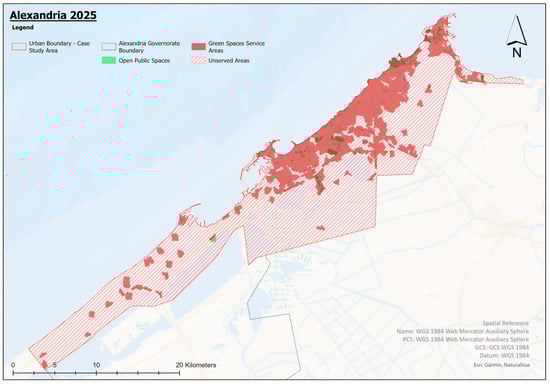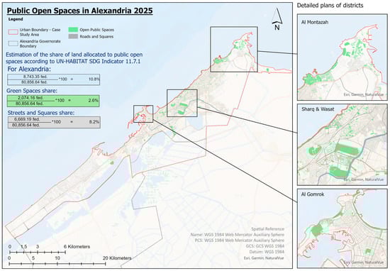 Public open spaces play a vital role in supporting social connection and leisure among residents, enhancing quality of life while contributing to both economic growth and environmental health. The rapid global urbanization underscores the critical link between urban environments and human health, which demands focusing on sustainable, health-conscious urban planning. Accordingly, Public and green spaces are vital in this context, as recognized by global agendas like the Sustainable Development Goals (SDG) 11.7. This research aims to objectively evaluate the availability of public open spaces (POS) in Alexandria, Egypt. This study will utilize Geographic Information System (GIS) to formulate a methodology that incorporates spatial data analysis for quantifying public open spaces and assessing the proportion of the population with convenient access to these areas, evaluating their coverage, service area isochrones, spatial distribution, and proximity to residential areas. The study will benchmark its findings against global standards to expose critical spatial inequalities within cities of the Global South. The primary aim is to present evidence-based recommendations for sustainable urban public space design, tackling availability and accessibility issues to improve the well-being of Alexandria’s expanding urban population. This research offers a scientific foundation to inform policy and decision-making focused on creating more equitable, healthier, and resilient urban environments.