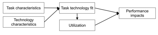People often select a suitable technology to fit their task characteristics for the improvement of their task performance. In order to examine how a technology can influence task performance, it commonly adopts the task–technology fit theory (TTF) to explore whether any demonstrable relationship concerning task–technology fit and users’ performance comes into effect (see Figure 3) [28]. Fit refers to the extent to how a technology tool can assist individuals as they complete their tasks. An individual is most often willing to adopt the technology if and only if the technology resembles the tasks to be implemented [29].