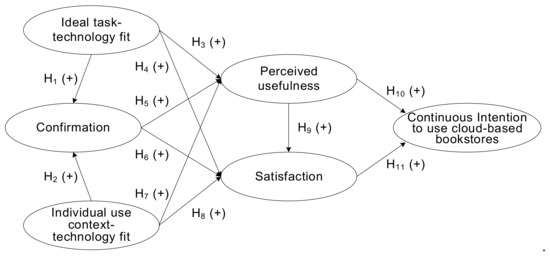 A number of studies agreed that all characteristics related to task, technology, and individuality have a significant influence on TTF and performance [4,41]. In [16], the authors argued that the task–technology fit actually captures task characteristics, technology characteristics, and individual characteristics, as well as their interactions. Therefore, it is sufficient to include only the task–technology fit construct (ideal TTF and individual use context–TF in our model) and using this construct as an endogenous variable. Thus, our model does not include these three variables. Rather, our model further deconstructed TTF into “ideal task–technology fit” and “individual use context–technology fit” using [39]. Ideal task–technology fit refers to the level of correspondence between teachers’ task requirements and cloud-based bookstores. Individual use context–technology fit refers to the degree of teachers’ awareness of the correspondence between the anticipation of cloud-based bookstores usage and how it matches their work context. Our study advocates that both types of fits can affect a change in the confirmation of users’ expectation, perceived usefulness of, and satisfaction with cloud-based bookstores. Confirmation of users’ expectations refers to the degree to which teachers’ awareness exists of the correspondence between the anticipation of cloud-based bookstore usage and how it matches actual performance criteria. Perceived usefulness refers to the extent of school teachers’ perceptions regarding the expected benefits of cloud-based bookstore use. Satisfaction measures teachers’ emotions that reflect the teachers’ experience of using cloud-based bookstores to be as pleasurable as anticipated.