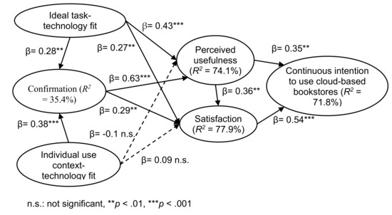 Corroborating with the proposition of the task–technology fit perspective [63] that a better task–technology fit leads to better performance, we find that our proposed deconstructed task–technology constructs significantly associate with teachers’ confirmation of their expectations. The influence of individual use context–technology fit (β = 0.38) on whether the user’s expectation can be confirmed is greater than ideal task–technology fit (β = 0.28); despite the fact that it cannot obviously and directly affect a user’s perceived usefulness and satisfaction, it can actually confirm the influence on the continuous use of cloud-based bookstore through expectation. This means that the application of information technology shall be considered along with a user’s situated context to generate the effect as far as cloud-based bookstore practitioners may be concerned.
