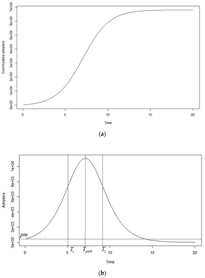 In Figure 1b the probability density function curve of the Bass model, the ordinate for the horizontal dashed line is pm, which refers to the innovators of Rogers. We can see that the distribution of the adoption time in the Bass model varies from the normal distribution that is proposed by Rogers [45].