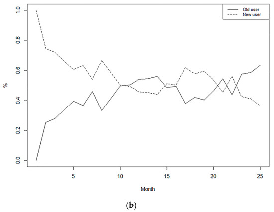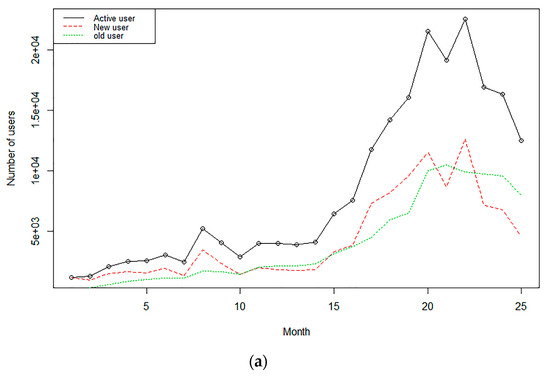 As shown in Figure 3a the change in the number of users and the number of new users slowly grew in the first 10 months, rapidly grew in the 15th to 22nd months, and then grew more slowly from the 23rd month. A total of 108,512 new users were added during the 25 months. The trend of active users was basically similar to that of new users. According to Figure 3b the change in the composition of users, the proportion of new users was initially higher than that of old users. The subsequent period witnessed an alternating change of high and low proportions. After the 23rd month, the proportion of old users was higher than that of new users. A total of 100,050 users were retained during the 25 months.